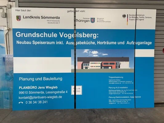 Für den Neubau der Grundschule Vogelsberg entstand ein mehrteiliges Bauschild im Großformat. Wir zeigen den Weg von der Druckdatei über die Panelierung im RIP bis zum fertigen Schild aus drei Teilen.
